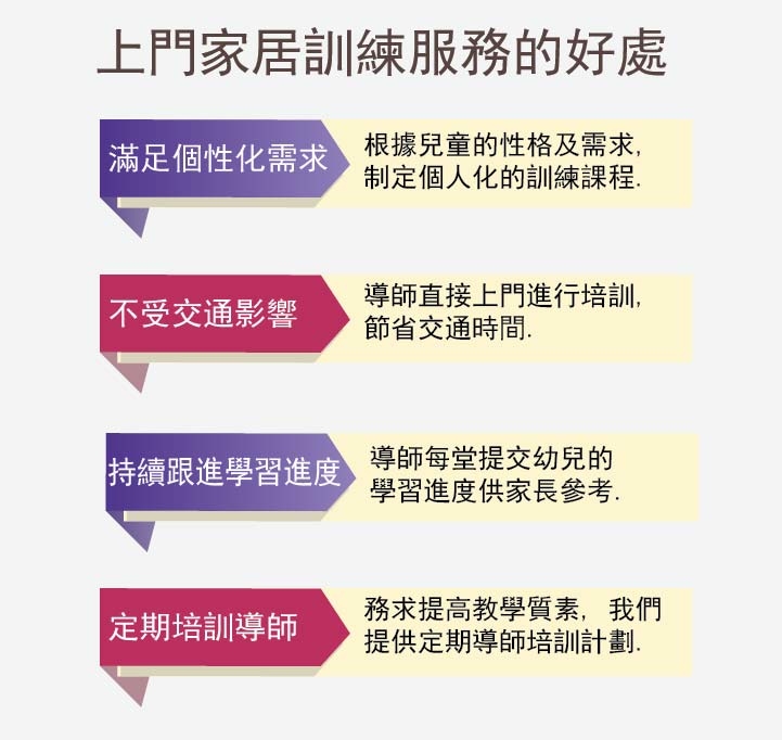 定期訓練:家居訓練基本為每星期一次,以確孩童的學習進度,亦可視乎家長要求,增加每週訓練次數。導師每節課後都會提供學習進度資料,方便家長日常在家跟進。