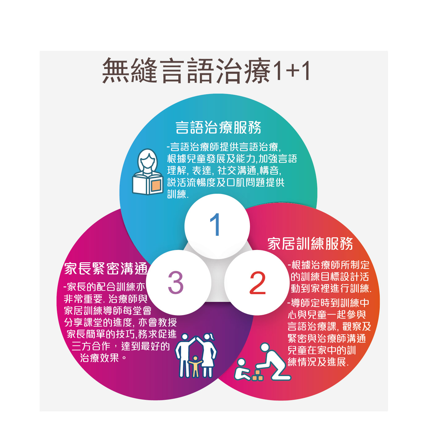 「心.計劃」與全港不同地區(包括港島、九龍、新界東、新界西)的言語治療中心合作,推出「無縫言語治療1+1」計劃,提供言語治療訓練及一對一上門訓練。